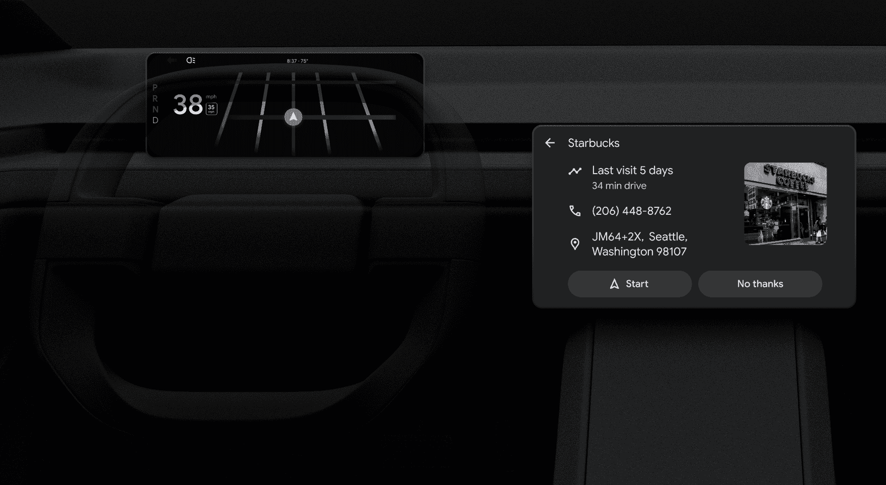Mock-up of the cluster view and head unit in a car, user taps a destination
