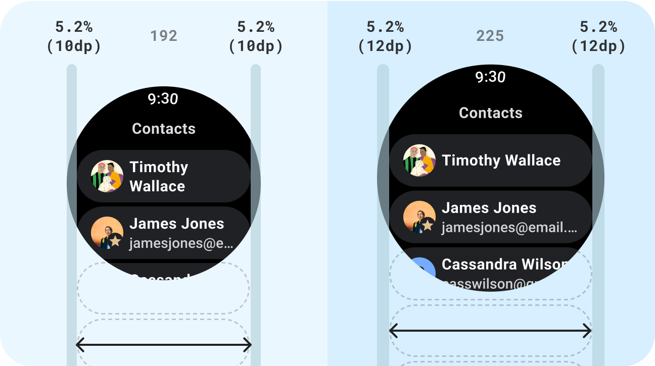 Responsive UIs stretch and change to make the best possible use of all available screen space, no matter what size screen they're rendered on. When designing responsive layouts on a round screen, scrolling and non-scrolling views each have unique requirements to maintain UI element scaling, as well as preserve a balanced layout and composition. For scrolling views, use percentages to define all top, bottom, and side margins to avoid clipping and provide proportional scaling of elements. For non-scrolling views, use percentages and vertical constraints for all margins. That way, the main content in the middle can stretch to fill the available area.