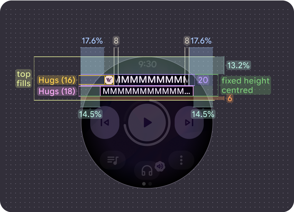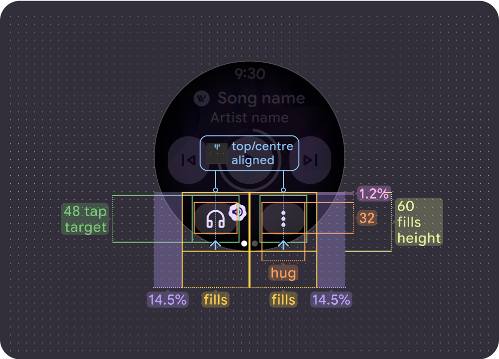 Main controls and bottom buttons use the available space to maximize the tap target. The minimum tap target size is 48 x 48 dp on Wear OS devices, with icons and buttons aligned to the center of the tap target.