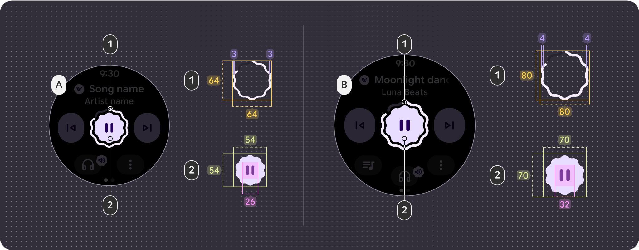 The main control is usually a play and pause button. After the 225 dp breakpoint, the control scales from 64dp to 80dp, which increases tap targets for all controls within it.