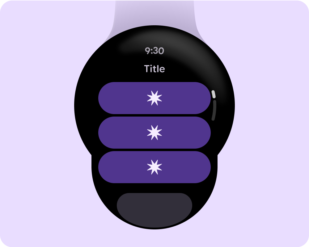 All components within the middle content section should be responsive, filling the available width up until the percentage margins. All scrolling layouts will have scaling-lazy-column behavior, showing the components scaling and fading off screen.