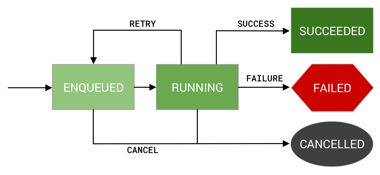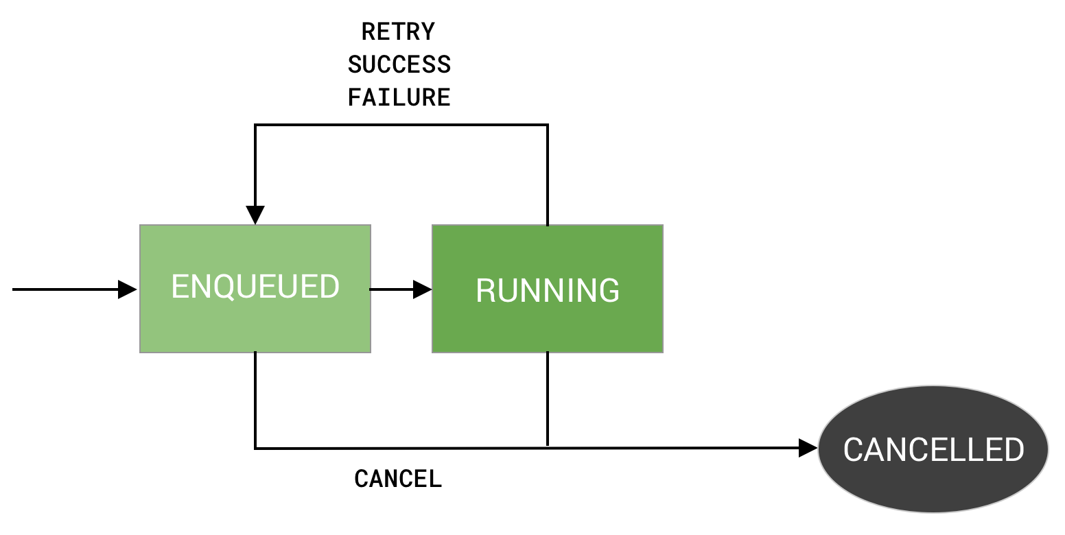 In the ENQUEUED state, your work is eligible to run as soon as its Constraints and initial delay timing requirements are met. From there it moves to a RUNNING state and then depending on the outcome of the work it may move to SUCCEEDED, FAILED, or possibly back to ENQUEUED if the result is retry. At any point in the process, work can be cancelled, at which point it will move to the CANCELLED state.