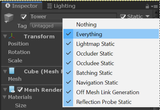 Make any objects that are affected by the baked lights Static. There are many optimizations for an object marked as static, but usually it's best to select Everything in the Static drop-down list. With the object marked as Static, Unity knows to include it in the light baking.