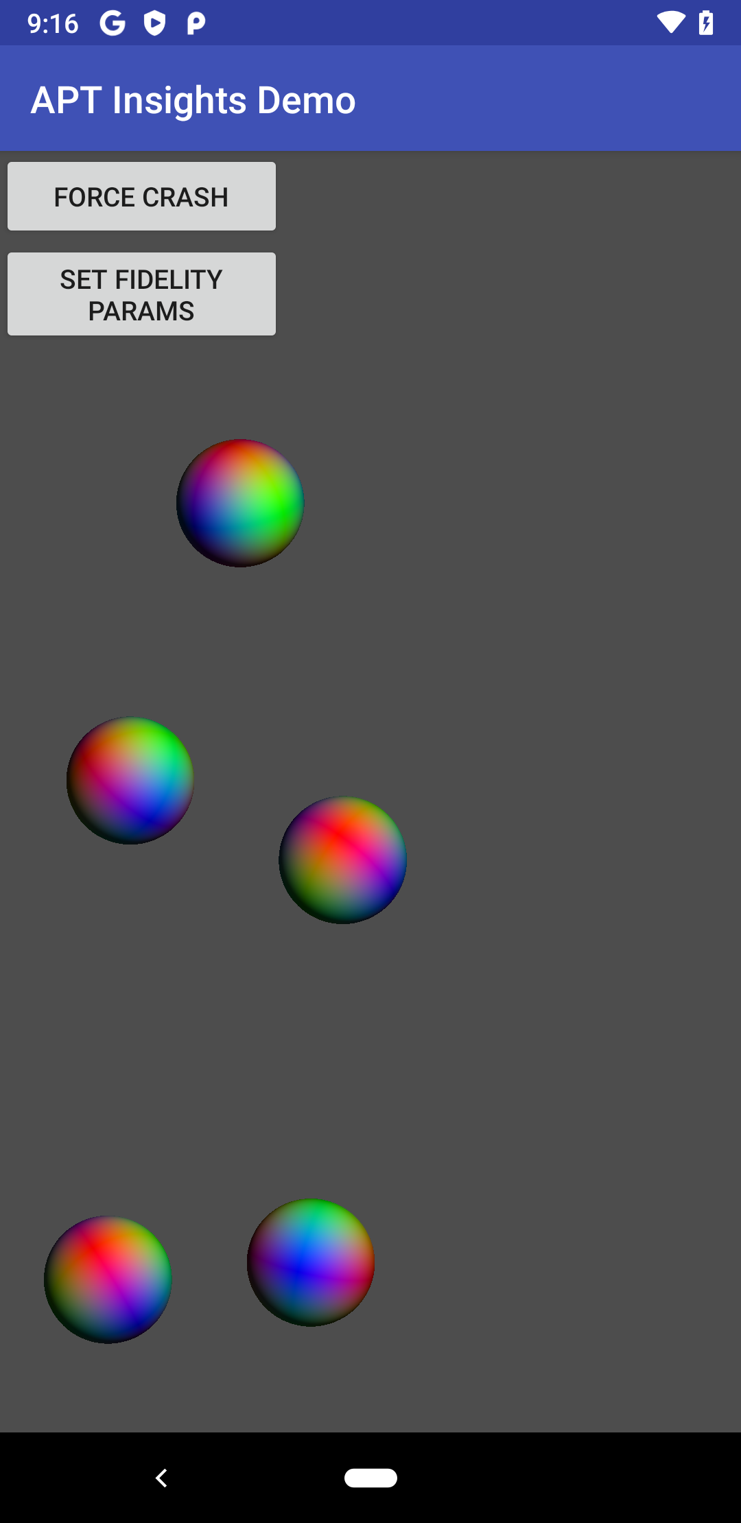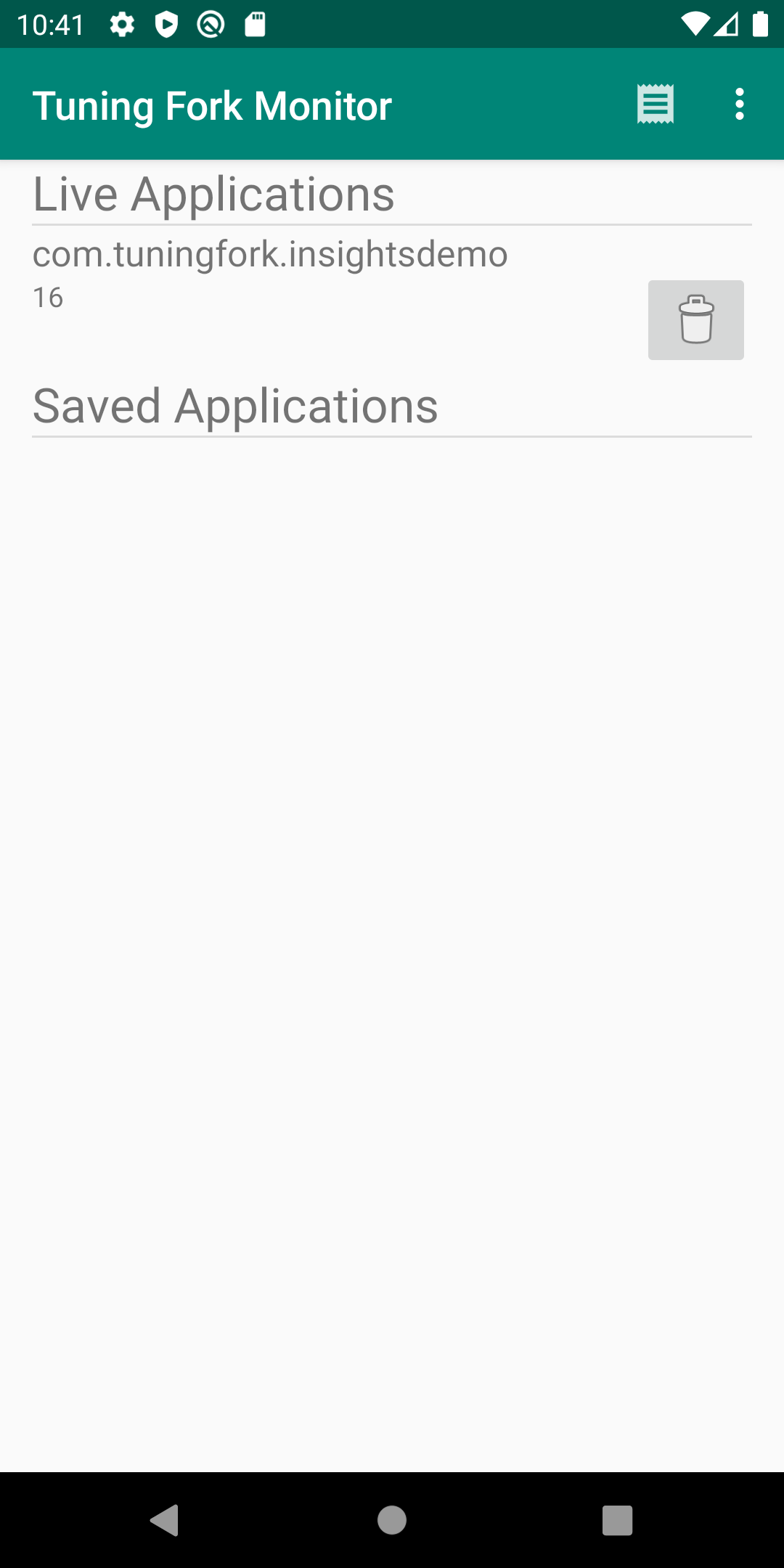 6. The demo app appears under Live Applications as com.tuningfork.insightsdemo 16. Tap this entry to see app details and live telemetry.