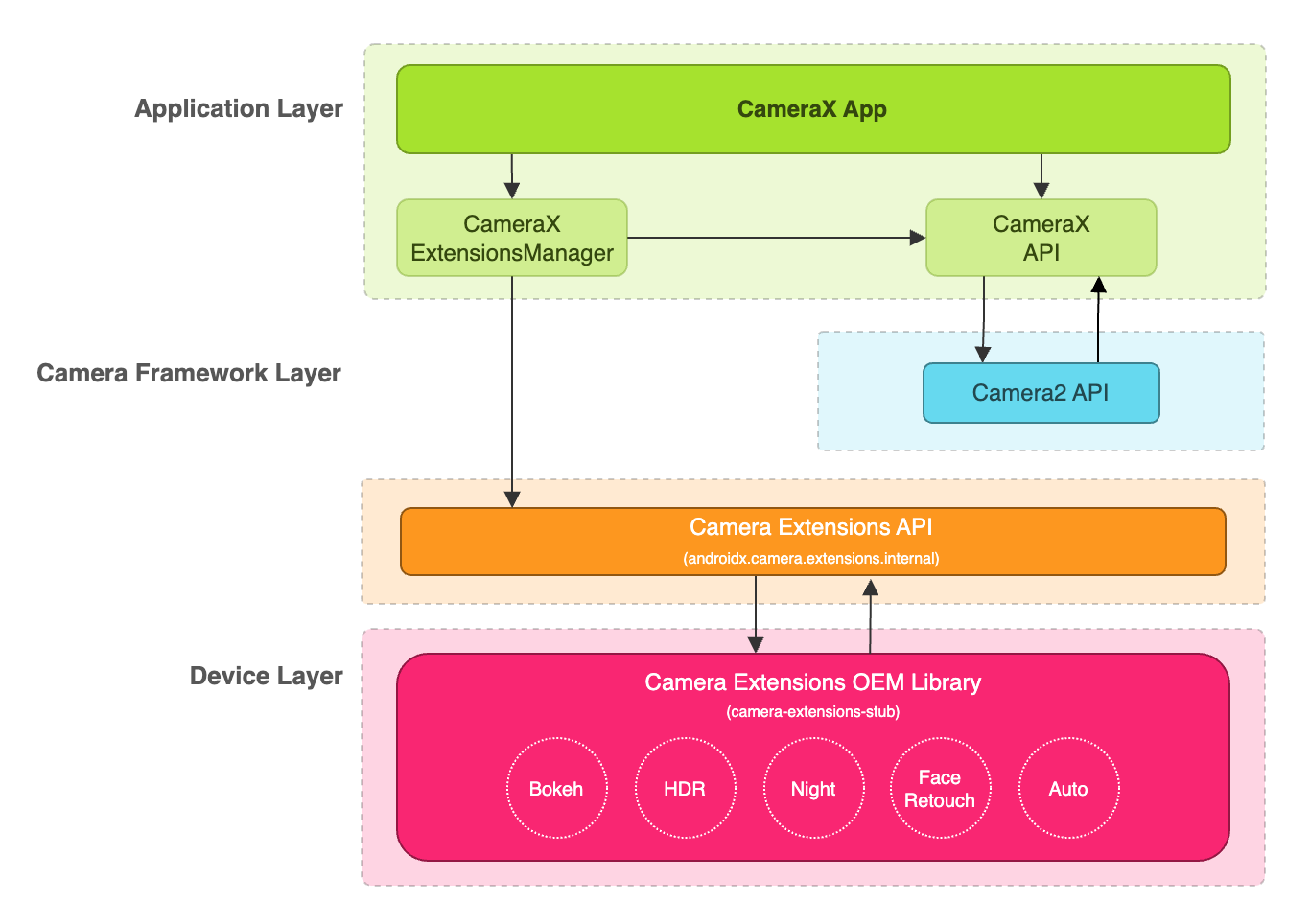 A CameraX application can use extensions through the CameraX Extensions API. The CameraX Extensions API manages querying for available extensions, configuring an extension camera session, and communicating with the Camera Extensions OEM library. This allows your application to use capabilities like Night, HDR, Auto, Bokeh, or Face Retouch.