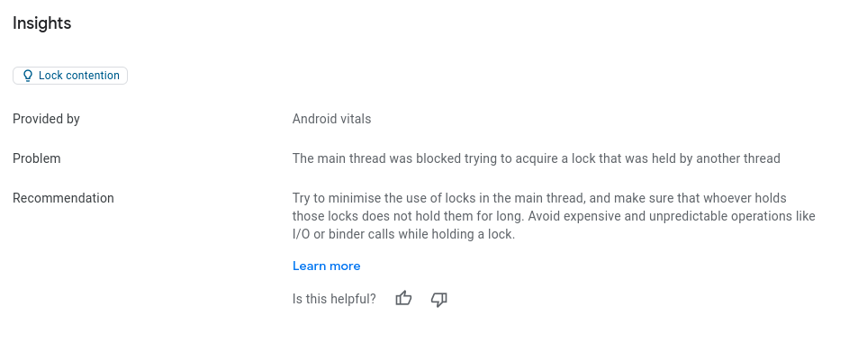 Play vitals can detect and help debug some of these common ANR causes. For example, if vitals detect that an ANR occurred because of lock contention, it can summarize the problem and recommended fix in the ANR Insights section.
