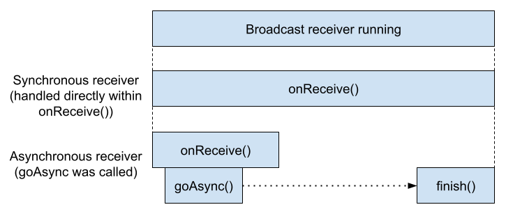 • If goAsync() is used, make sure PendingResult.finish() is called quickly. This is subject to the same ANR timeout as synchronous broadcast receivers.