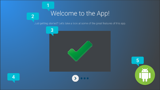 - The page content view, in this case a simple green checkmark in a grey box. This view is optional. Use this view to illustrate page details. For example, you might include a screenshot that highlights the app feature the page describes.